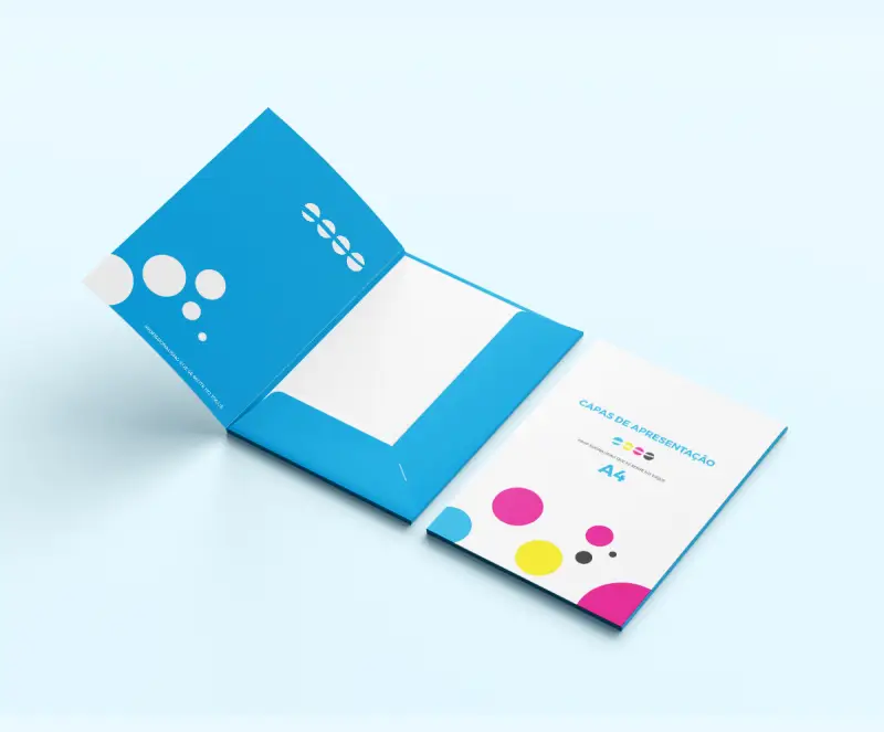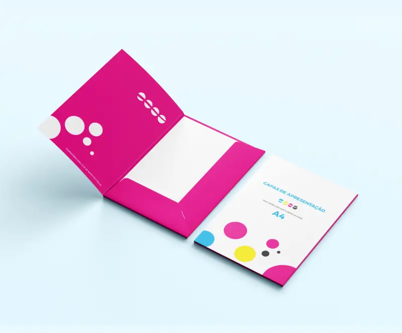 Impressione com profissionalismo usando as nossas Capas de Apresentação com Abas A4. Além disso, a impressão a cores em papel couché mate de 350g garante durabilidade e um acabamento sofisticado, destacando suas apresentações, propostas ou relatórios.